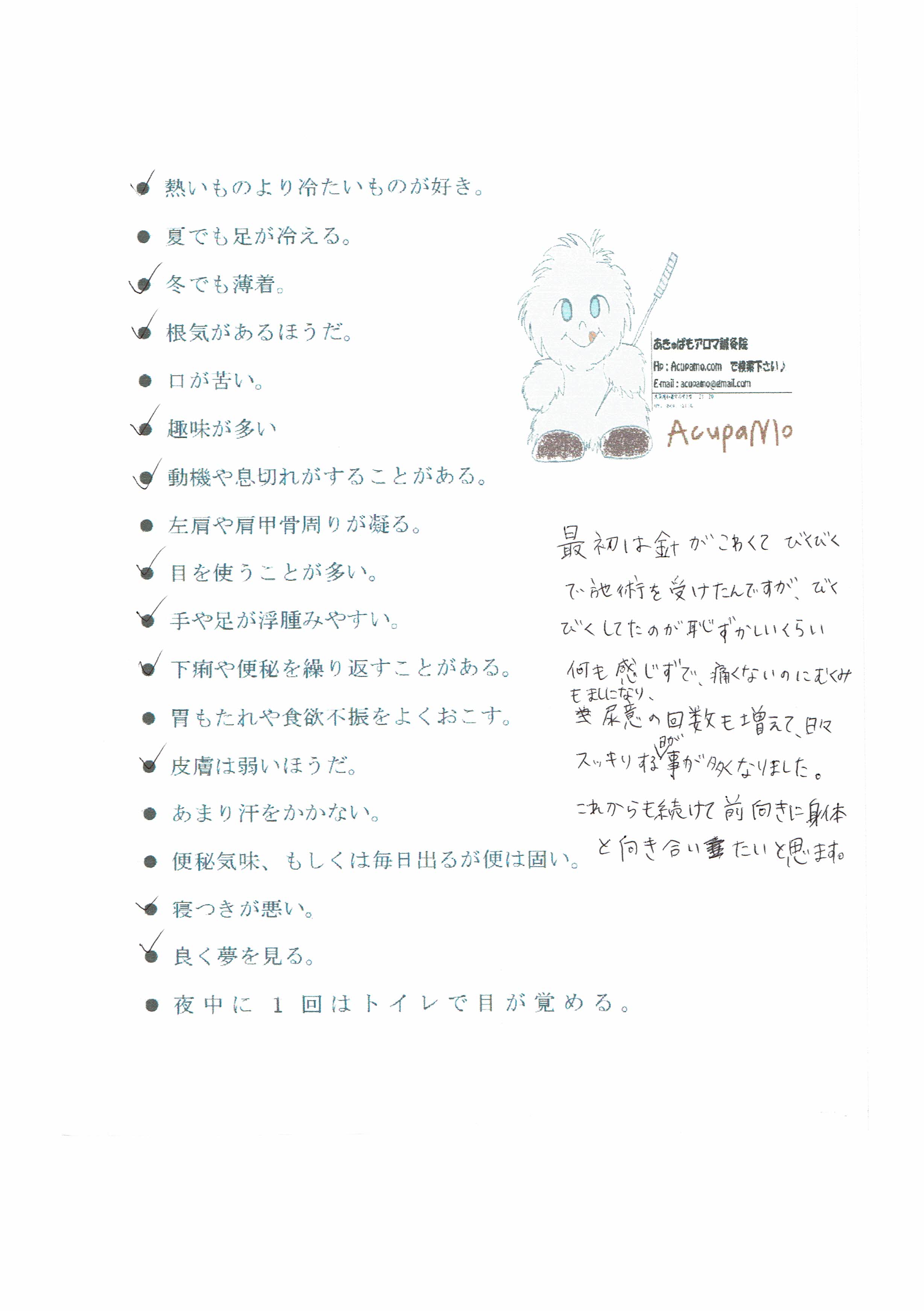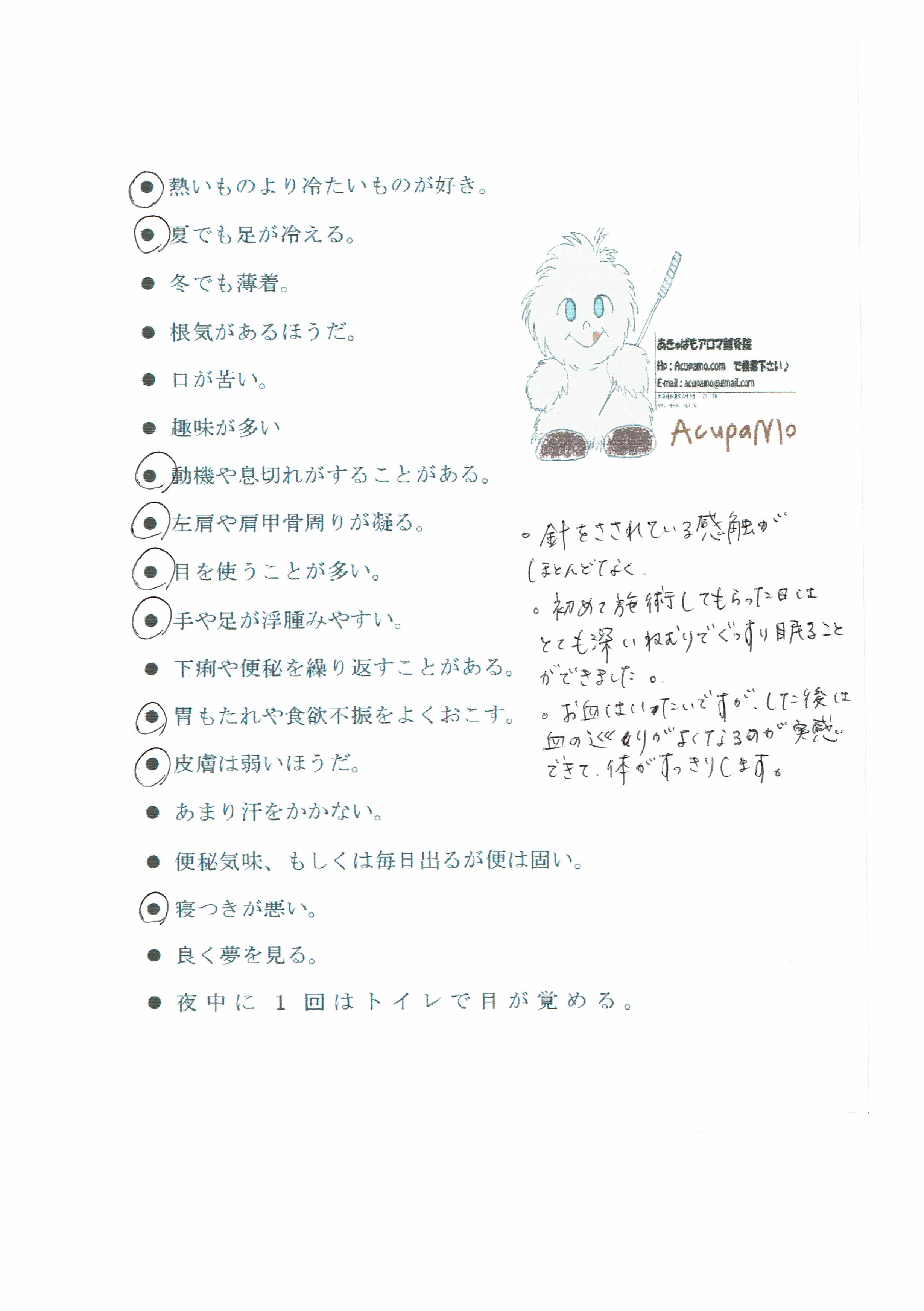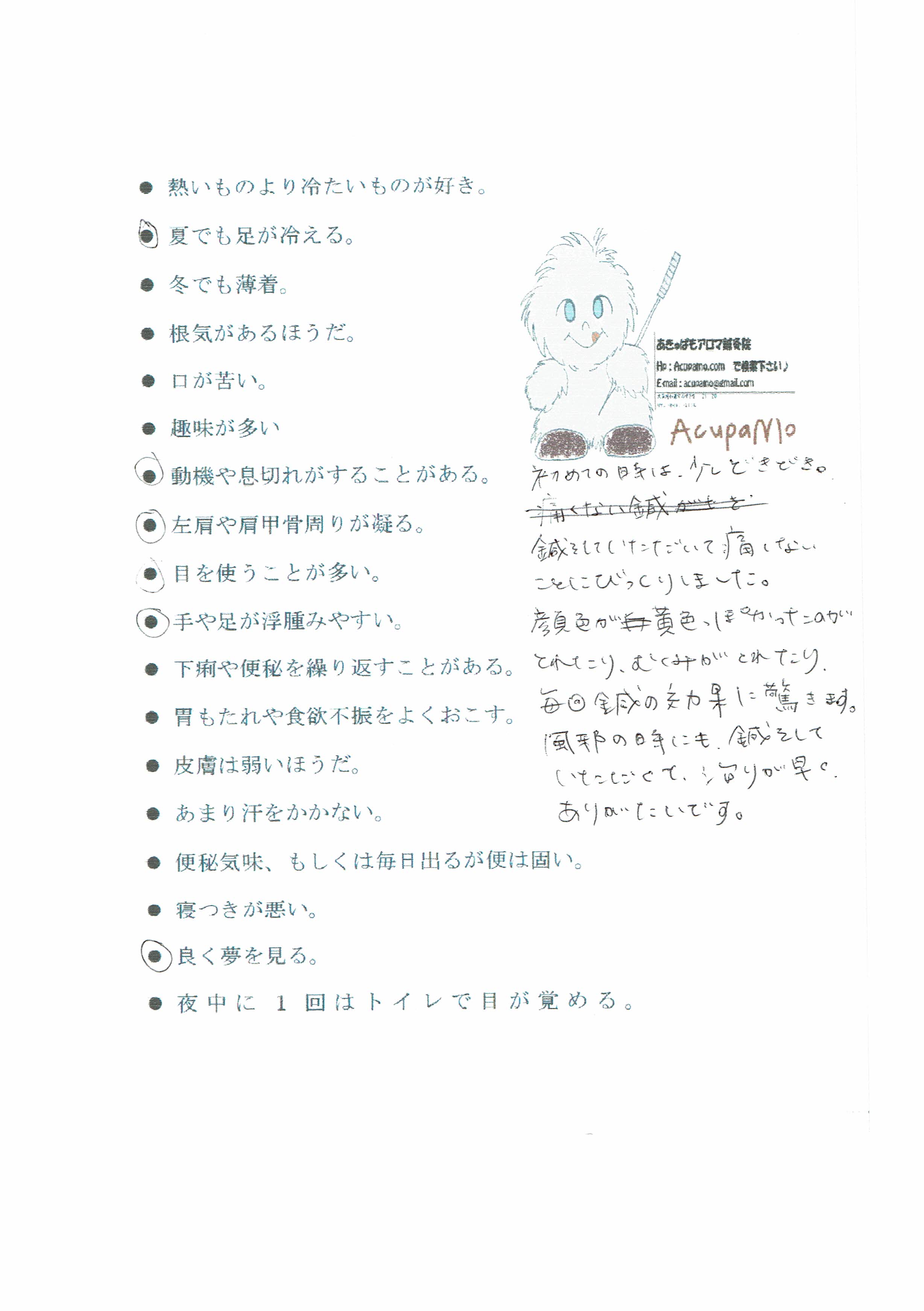 ・調子がよくなり鍼灸が好きになった患者様