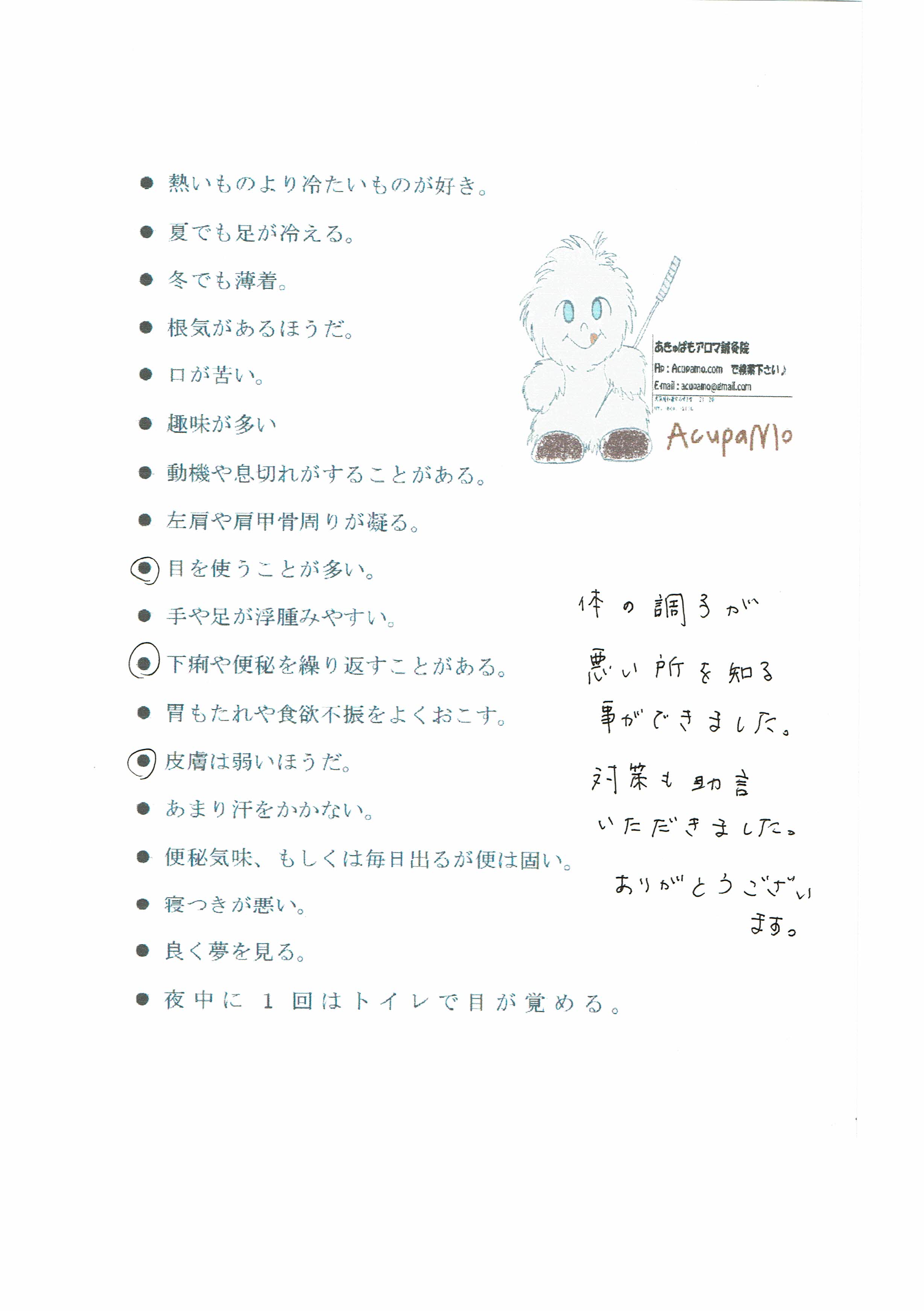 体の調子が悪い所を知る事ができました。対策も助言いただきました。ありがとうございます。