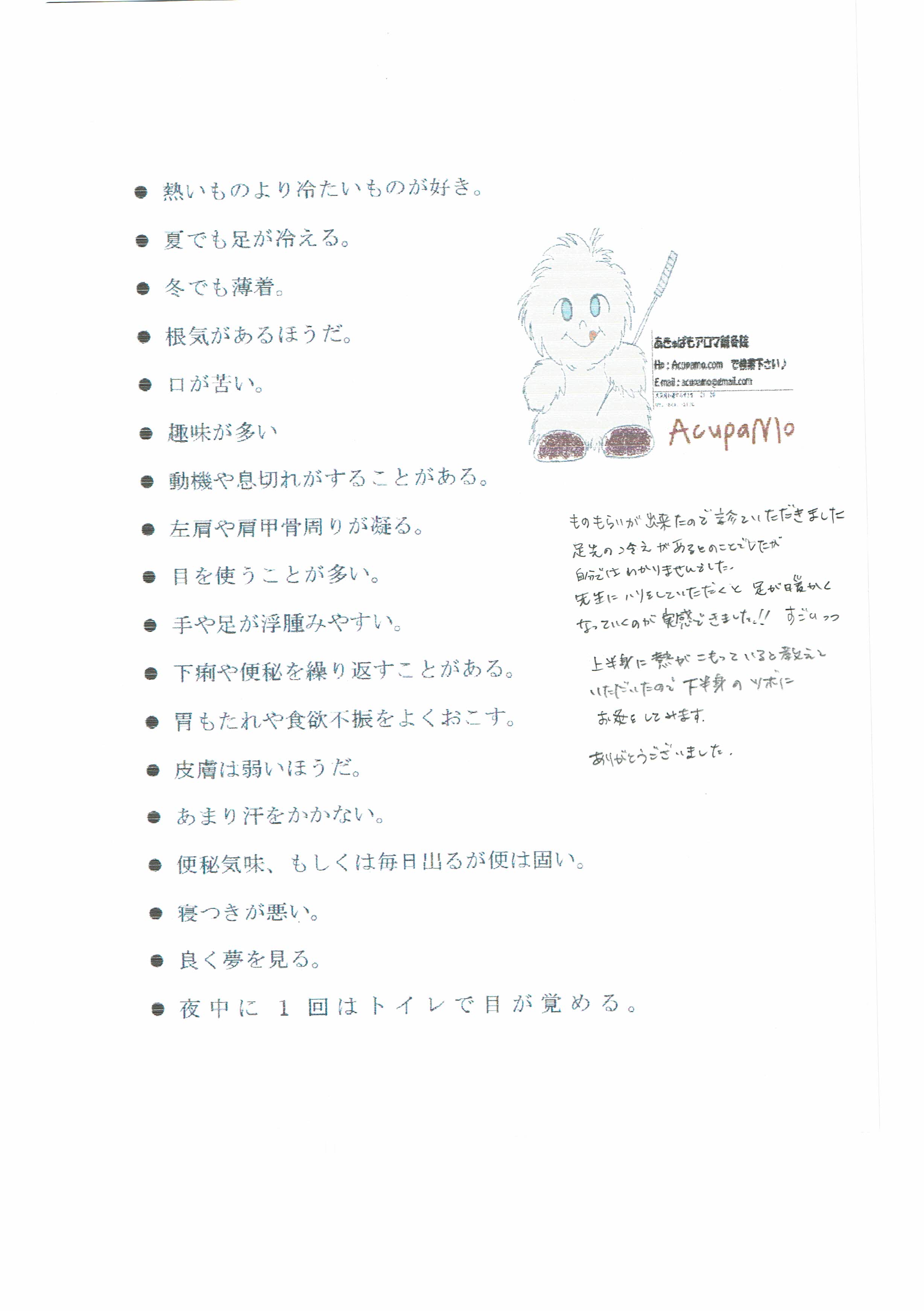ものもらいが出来たので診ていただきました。足先の冷えがあるとのことでしたが自分ではわかりませんでした。